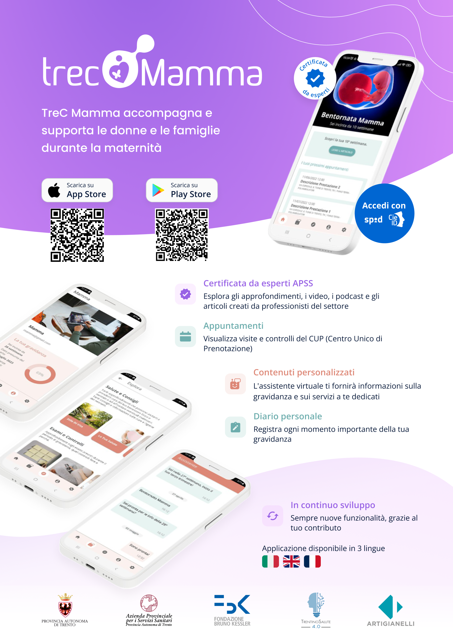 Intanto TreC Mamma rientra nelle azioni del programma sperimentale di innovazione e ricerca sanitaria del progetto provinciale "Sanità digitale e Intelligenza Artificiale – strumenti per avvicinare il Servizio sanitario ai cittadini e per lo sviluppo del sistema provinciale", approvato dalla Giunta provinciale lo scorso dicembre 2022.